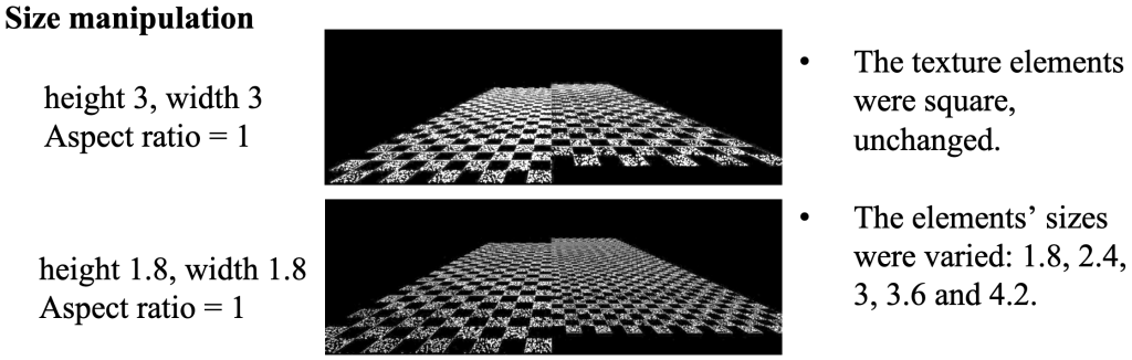 Abstract: Bingham et al. (2022) investigated which property of the texture on a support surface is used to perceive relative distance and found it was the texture image shape. This study further investigated the use of image shape by manipulating texture image size and the aspect ratio of optical texture elements. We found that variations in the size of the texture elements influenced relative distance perception. However, when manipulating aspect ratio, changes in the width were not significant, while the image height was, which is consistent with Chen & Saunders (2020) showing that compression of optical texture was used in slant perception. Reconsidering Bingham et al. (2022), we concluded that the relative compression of optical texture (image height) is used as monocular information about relative distance.