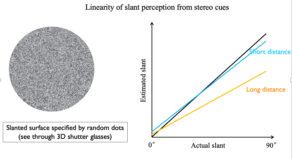 Slant perception from stereo cues (binocular disparity) refers to how we use the differences between the images seen by our left and right eyes to estimate surface tilt. Unlike slant perception from texture cues, which often exhibits nonlinear distortions, slant perception from stereo cues tends to be more linear—meaning that perceived slant closely follows actual slant in a nearly proportional manner.